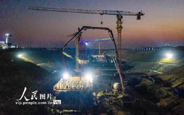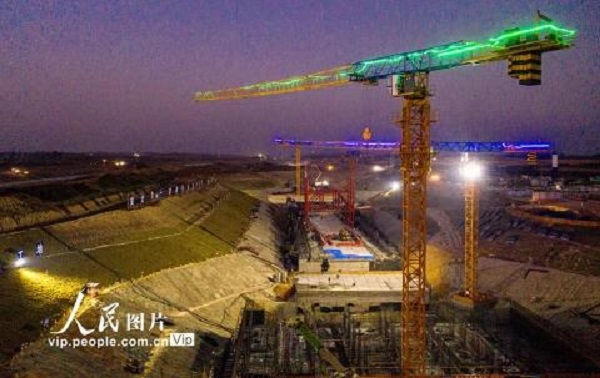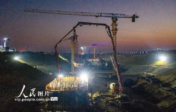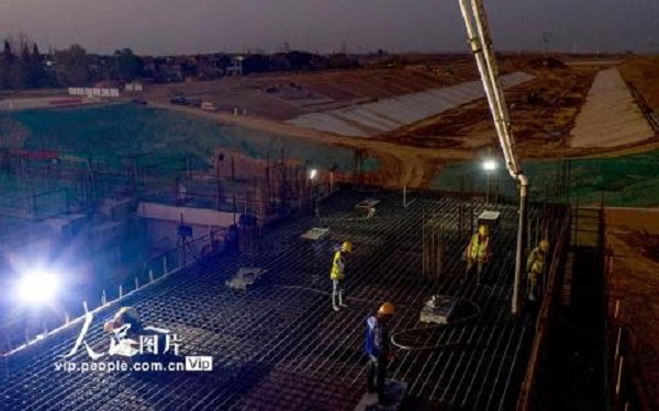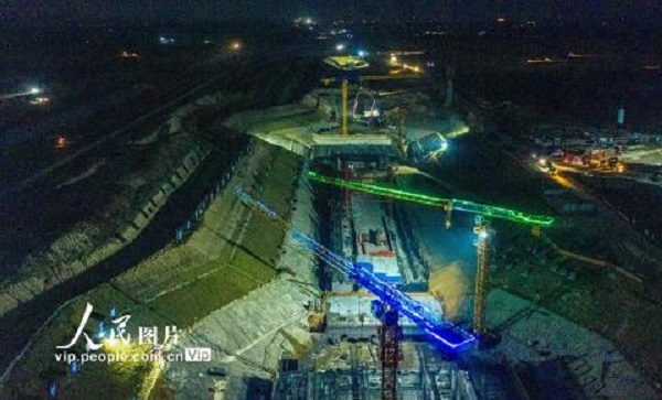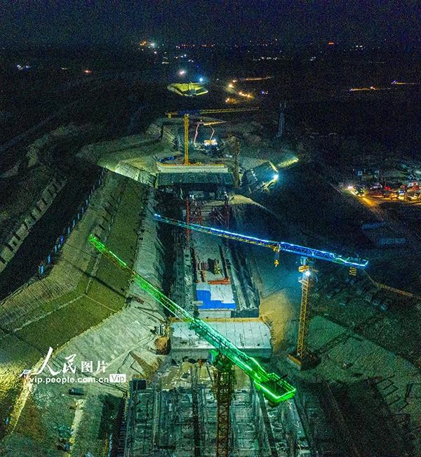 2020年11月15日,引江濟淮工程安徽省合肥市廬江縣廬城鎮(zhèn)廬江節(jié)制閘施工現場,建設者們正挑燈夜戰(zhàn)加快工程進度。