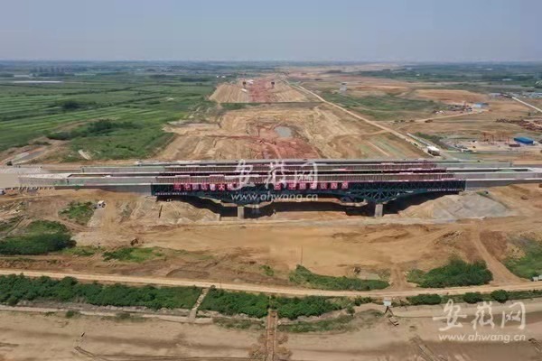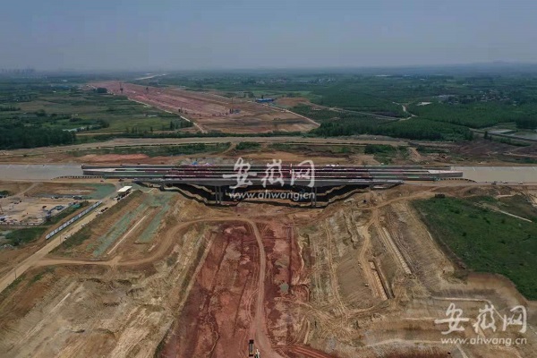 據介紹,淠河總干渠渡槽工程由中鐵四局和中國鐵建大橋局聯合承建,是引江濟淮重大節點工程。渡槽總長 350 米,分左右兩幅,其中鋼渡槽全長246 米,總用鋼量達 2.1 萬噸。設計流量150立方米每秒,設計水深4.0米,為Ⅵ級航道,通行100噸級船舶。橋跨布置采用 68 米 +110米 +68 米的三跨鋼結構桁架式梁拱組合設計,主跨跨度達 110 米,是目前世界上單跨最大的通水通航鋼結構渡槽。渡槽下部為引江濟淮Ⅱ級航道,兩航道高差約30米。