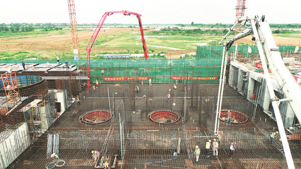 8月12日,在肥西縣嚴店鄉(xiāng)引江濟淮派河口泵站施工現(xiàn)場,工人們正在澆筑泵站第二聯(lián)出水流道混凝土。隨著第一車混凝土的順利入倉,標志著該重點工程項目在停工近一個月后正式全面復工。據(jù)悉,引江濟淮派河口泵站工程位于派河下游的蓮花圩內(nèi),受今年汛情影響,工程在7月19日暫時停工。為了保護安徽省一號工程不受洪水威脅,當?shù)馗扇汉腿嗣褡拥鼙岆U,對派河大堤進行了緊急除險加固,保住了大堤,為項目復工贏得了時間。
