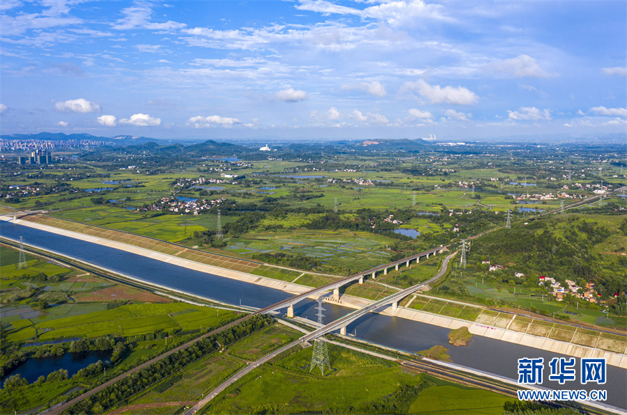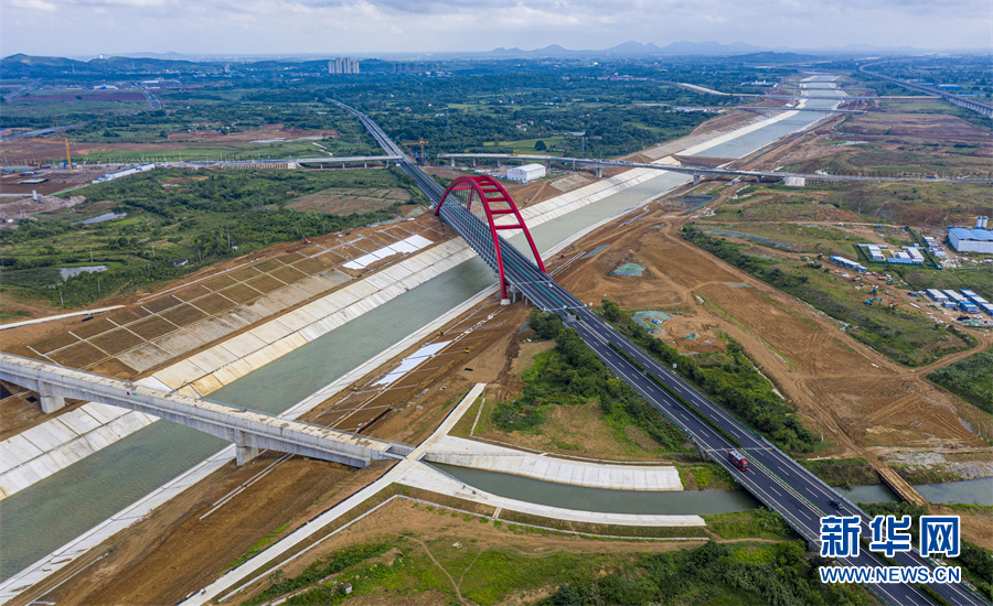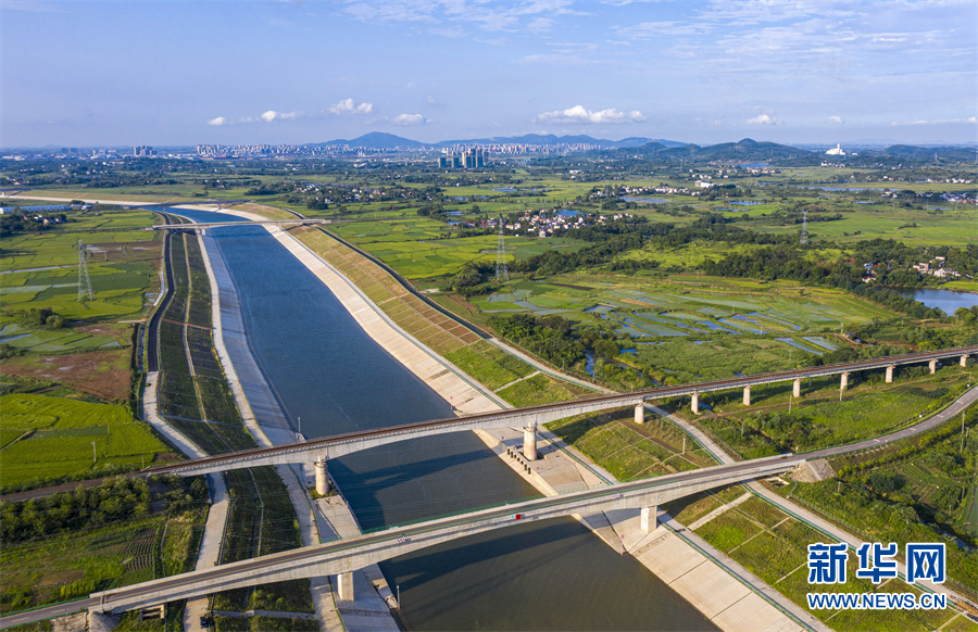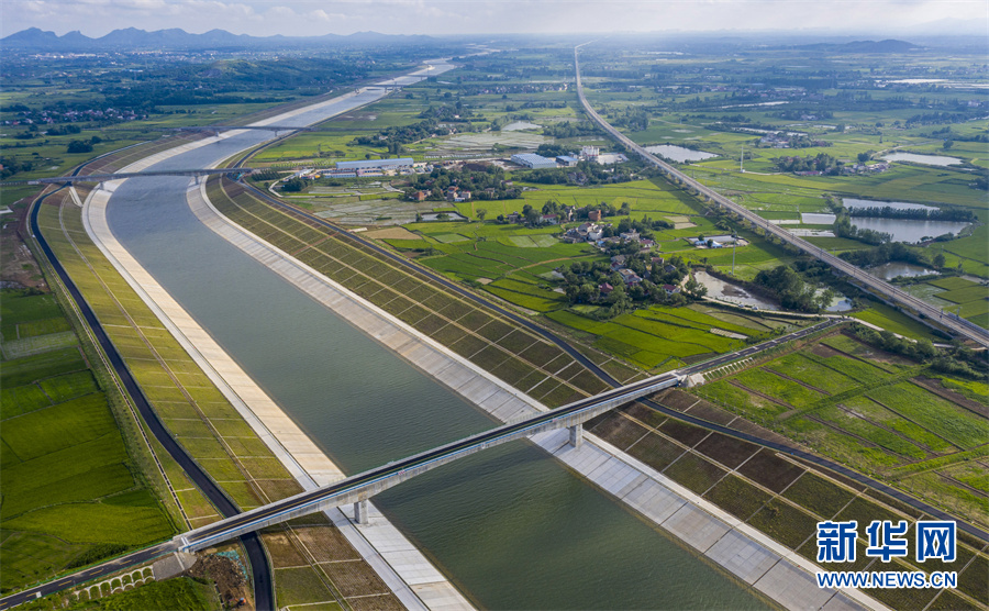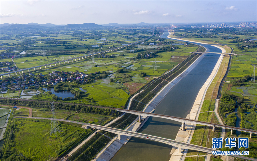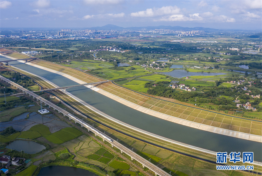 6月28日,安徽省合肥市廬江縣柯坦鎮境內的引江濟淮工程雄姿展現,河道、高鐵、公路在綠野中交匯,景美如畫。