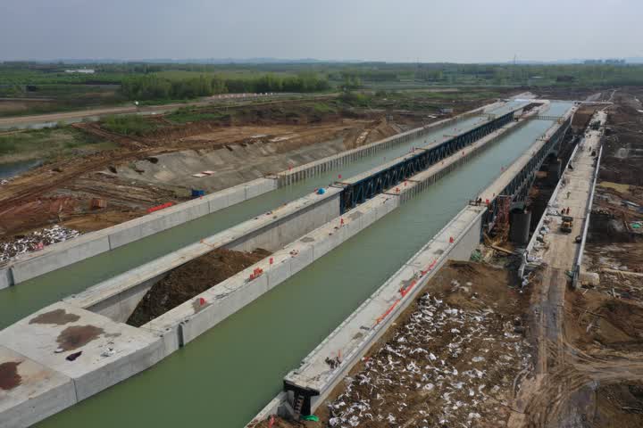 據悉,淠河總干渠渡槽總長350米,分左右兩幅,其中鋼渡槽全長246米,總用鋼量達2.1萬噸。鋼渡槽采用68米+110米+68米的三跨鋼結構桁架式梁拱組合設計,主跨跨度達到110米,比目前世界著名的德國馬格德堡水橋還要長3.8米,是目前世界上跨度最大的通水通航鋼結構渡槽。
