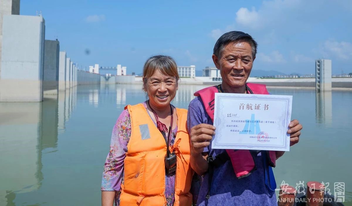 當天上午,記者來到了引江濟淮樅陽船閘。10時58分,伴著汽笛鳴響,裝載680噸鋼材的“昌盛6288”號散貨船由樅陽小港航道向北,緩緩駛過樅陽船閘,進入引江濟淮菜子湖線。作為航道試運行通過樅陽船閘的首艘貨輪,安徽省引江濟淮工程有限責任公司為其頒發了“首航證書”。