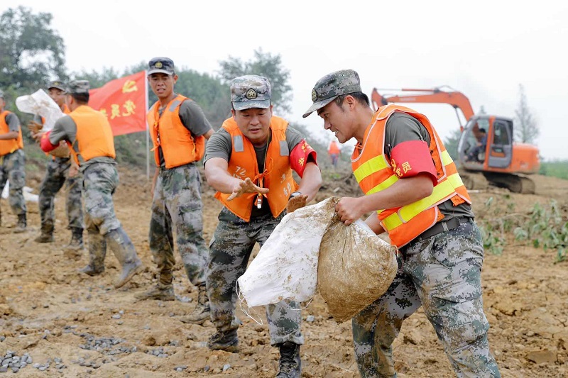 嚴店鄉蓮花圩派河大堤上,官兵奮戰在抗洪搶險一線。