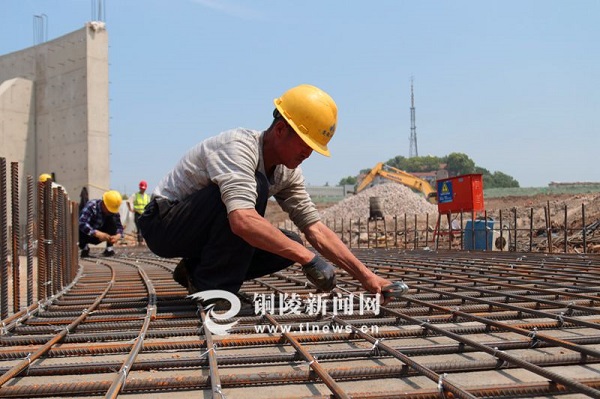5月2日,記者在引江濟淮工程樅陽樞紐節制閘施工現場看到,大型挖掘機、工程運輸車等大型機械和施工人員正緊張有序作業。正在和工友們一起用鐵絲綁扎雷諾護墊,鋪設防沖槽的瓦工何池玉告訴記者,他來自安慶市迎江區,今年因疫情影響沒有到外省務工,而是選擇參與到引江濟淮工程樅陽樞紐的建設。“這個工程重大,質量要求也高,工期又很緊,最近一段時間大家都是加班加點地在工作,‘五一’期間沒有一個回家的,確保按時按質按量地完成每一項工作。”