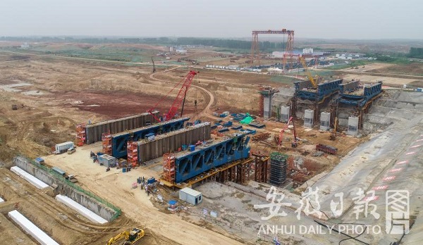 淠河總干渠鋼渡槽“水橋”橫跨引江濟淮主河道,兩條河道高差達30米左右,將形成“天河”與“地河”交叉的壯麗景觀。工程預計今年年底實現合攏,明年3月底將達到通水條件。